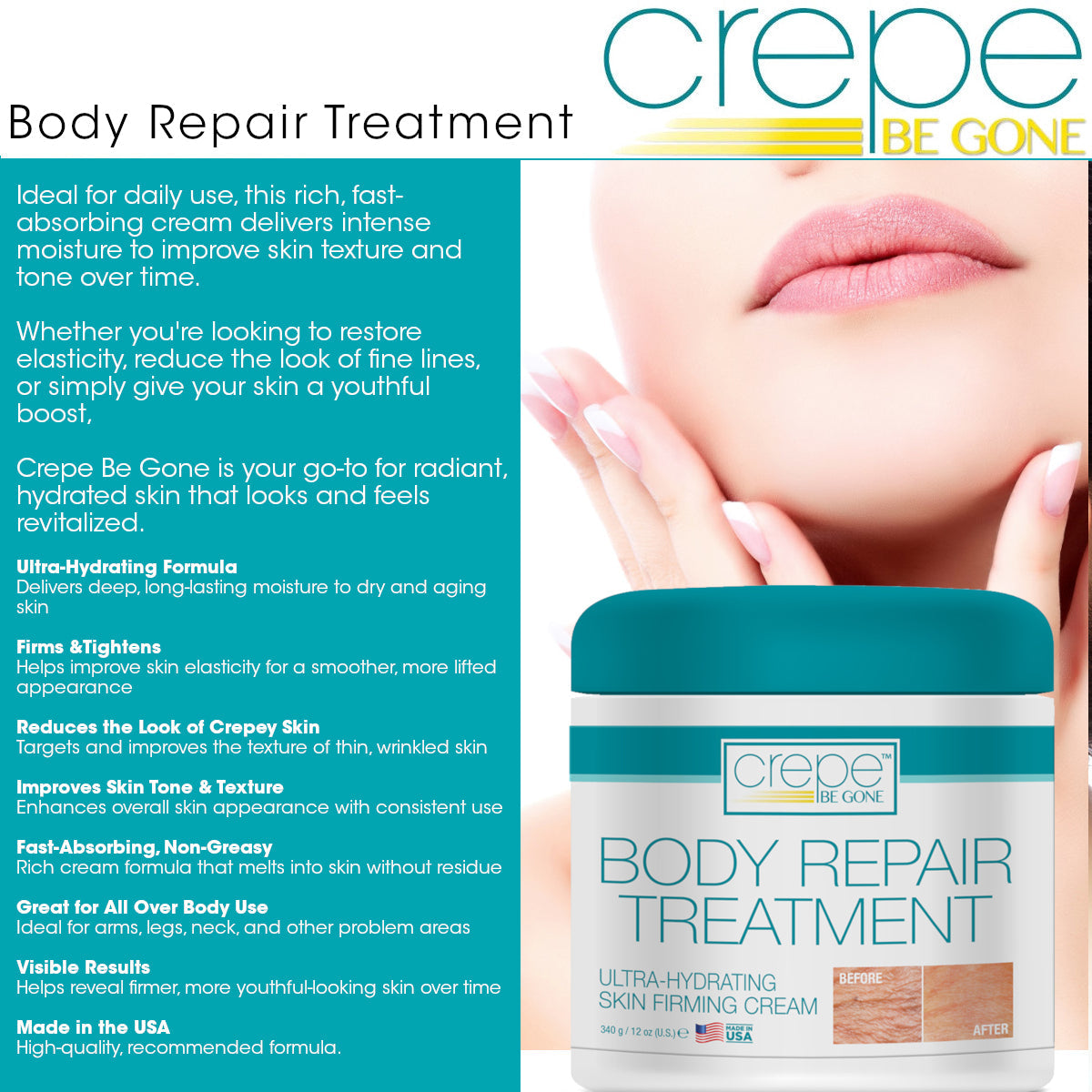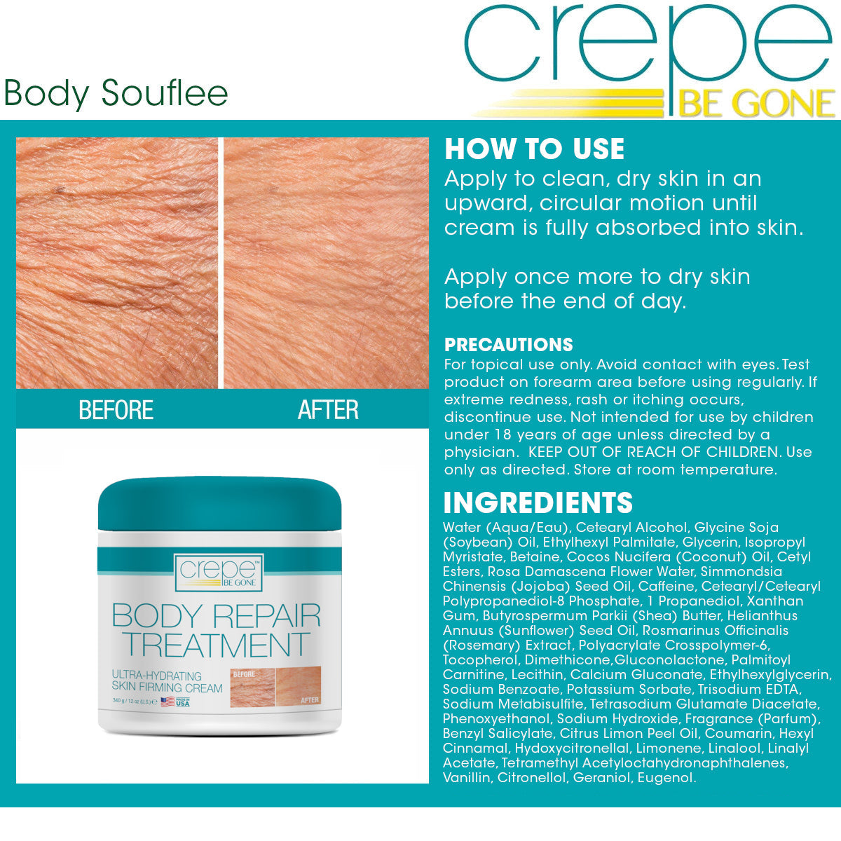Reveal smoother, firmer, and more radiant skin with Crepe Be Gone Body Repair Treatment. This luxurious ultra-hydrating skin firming cream is specially formulated to target dry, aging, and crepey skin on the arms, legs, neck, and body.