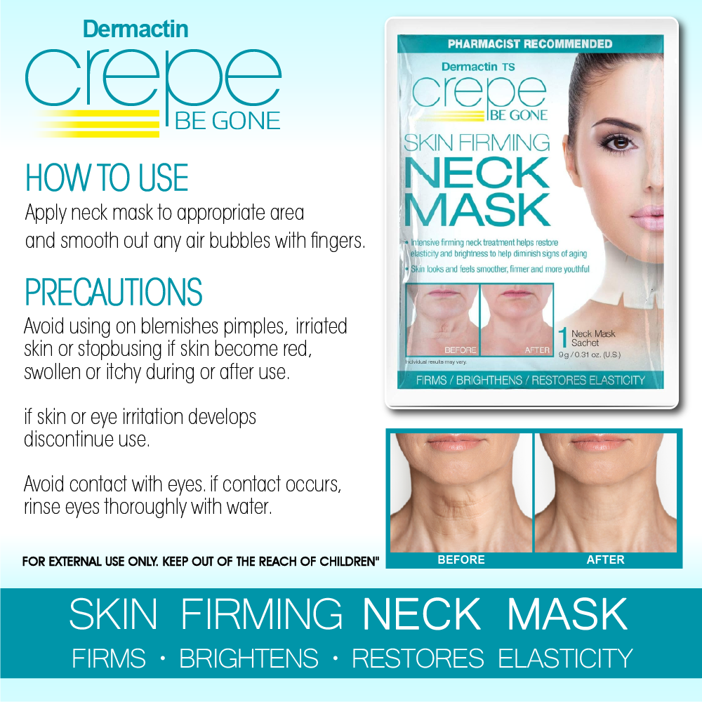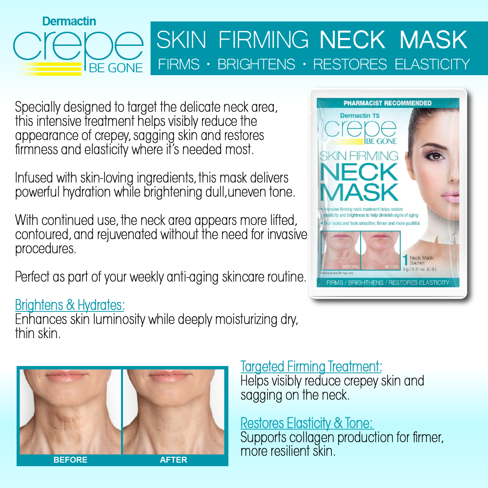 Rediscover smoother, firmer, and more youthful-looking skin with the Dermactin Crepe Be Gone Skin Firming Neck Mask. Specially designed to target the delicate neck area, this intensive treatment helps visibly reduce the appearance of crepey, sagging skin and restores firmness and elasticity where it’s needed most.